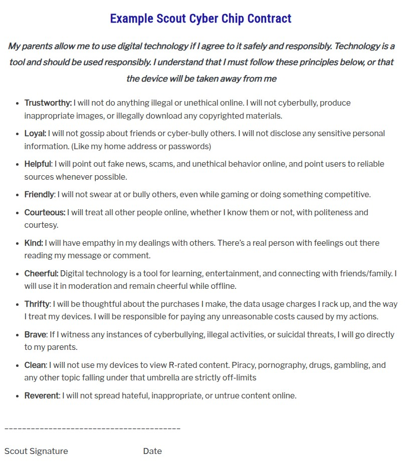 - Trustworthy: No illegal downloads or cyberbullying.- Loyal: Protect passwords and avoid gossip.- Brave: Report harmful content to adults1. Scouts and parents sign the agreement, with violations leading to device restrictions15.